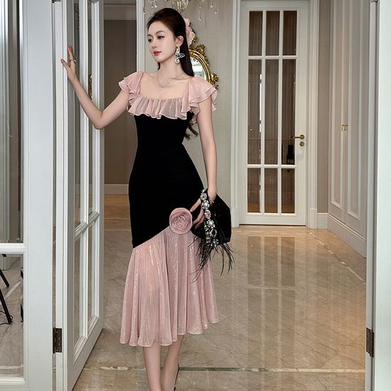 ROUND NECK RUFFLE TRUMPET SPLIT DRESS TFT21644